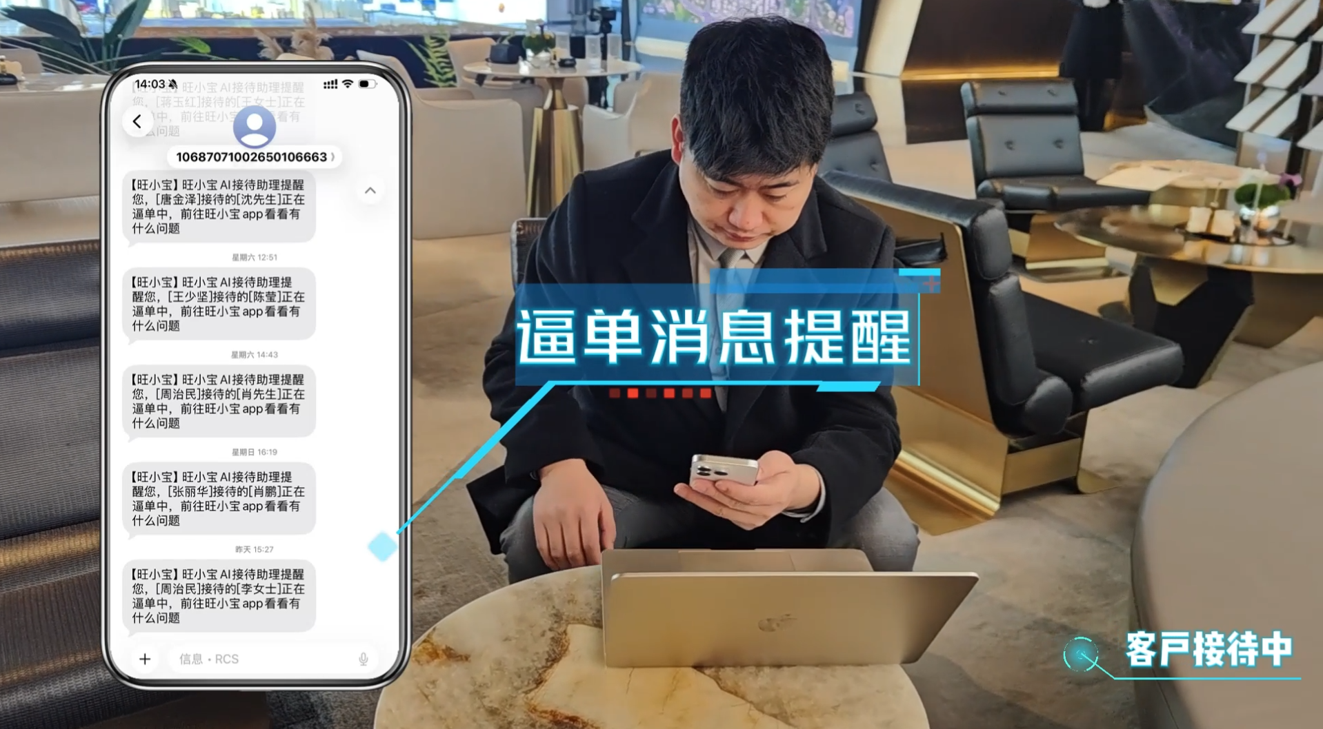 项目销售经理打开APP通过【旺销冠】(即旺工牌)的【AI超级辅助】(即实时销售智能体)实时查看和收看置业顾问的接待过程,就像看直播一样,并借助AI提供促单提醒、丢单预警、成交信号等实时指导。