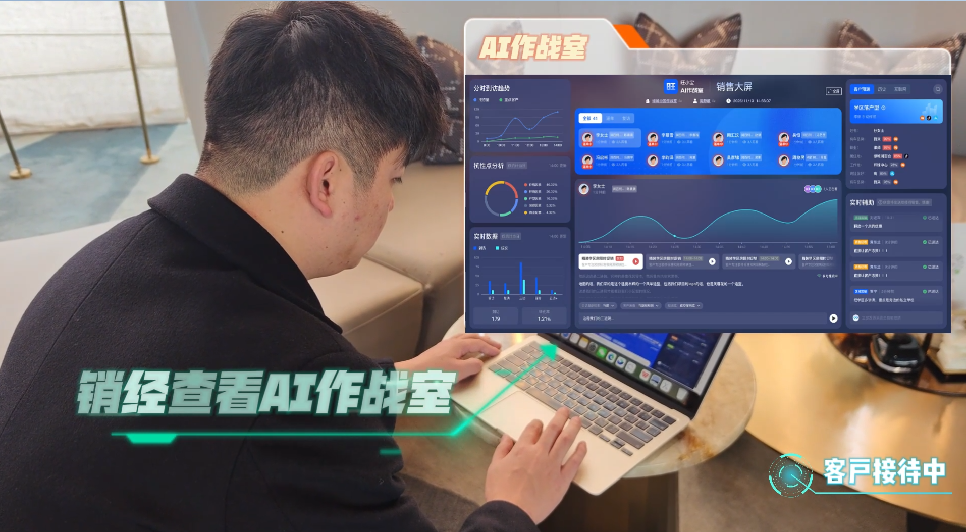 置业顾问的接待过程变得像“直播”一样实时,销经可以实时掌握洽谈动态,同时借助AI促单,销经可以及时介入谈判过程,精准辅导顾问化解成交障碍。接待过程从单兵作战转为智能支撑与兵团化作战。每一次到访,有了更高的成交可能。